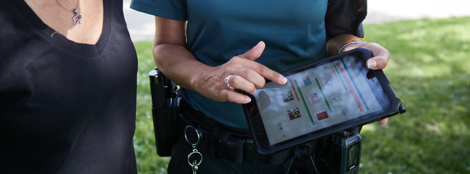 [Alt text: A woman in uniform from Spain’s Guardia Civil shows another woman an app on a tablet. Their smiles convey trust and cooperation, representing community safety and accessible communication between citizens and law enforcement.]