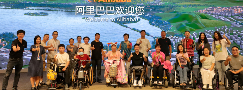 [Alt text: A diverse group of people, including wheelchair users, stand together smiling in front of a large digital screen at Alibaba headquarters. The scene represents inclusion, accessibility, and empowerment in the workplace, celebrating equal participation in technology and innovation.]