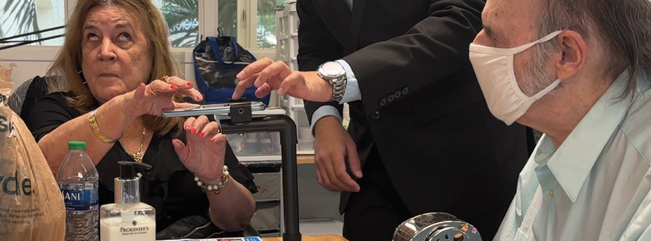 [Alt text: An elderly woman and man, the latter wearing a face mask, sit at a table while a younger person helps them with a tactile art activity. The scene reflects intergenerational respect and inclusive creativity, supporting active participation regardless of age or ability.]