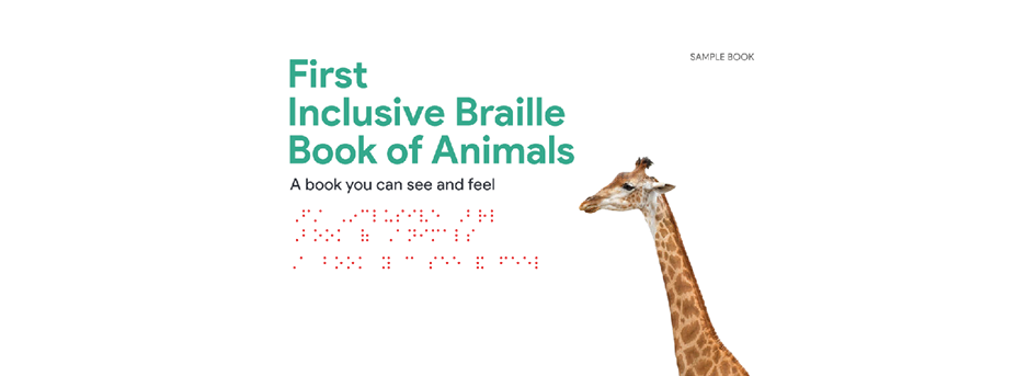 [Alt text: A cover of a book titled “First Inclusive Braille Book of Animals.” It features a giraffe and an elephant, representing the theme of nature and inclusivity. The subtitle reads “A book you can see and feel,” emphasizing accessibility for both sighted and visually impaired readers through Braille and tactile elements.]