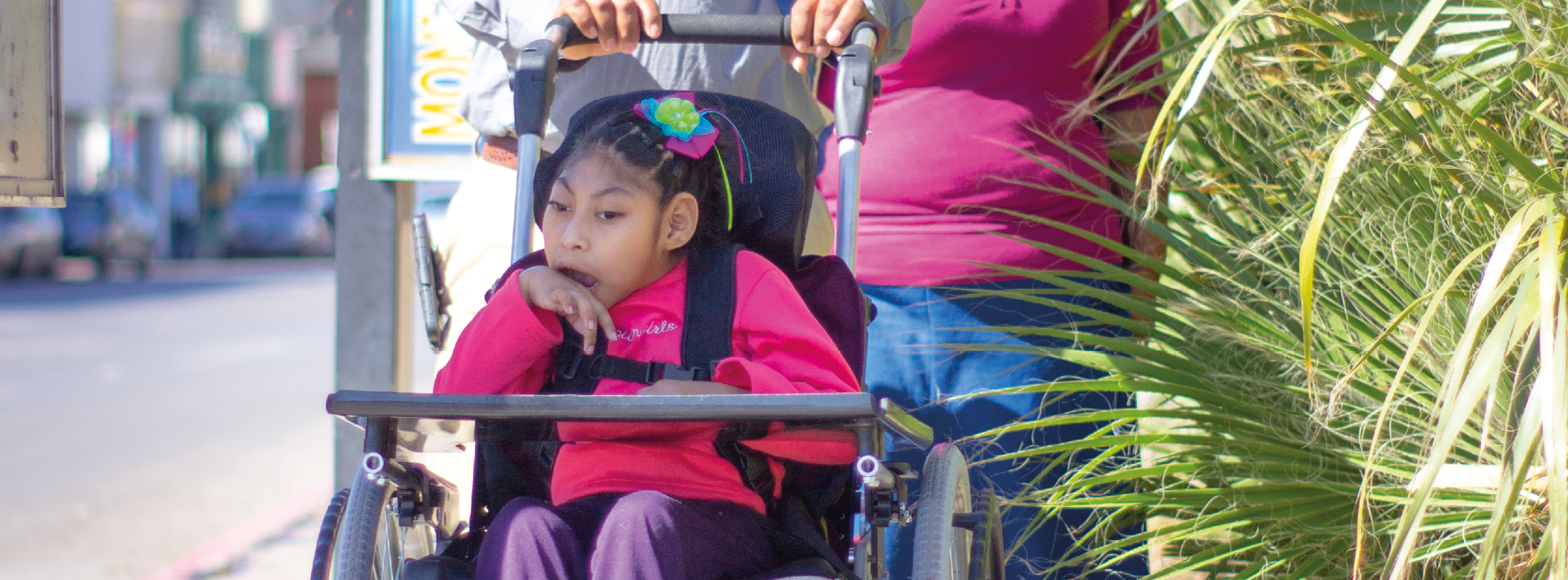 [Alt text: A family walks along a sunny street as a father pushes a young girl in a wheelchair, accompanied by her mother. The image gently conveys love, care, and the importance of accessible urban spaces for all families, including those with disabilities.]