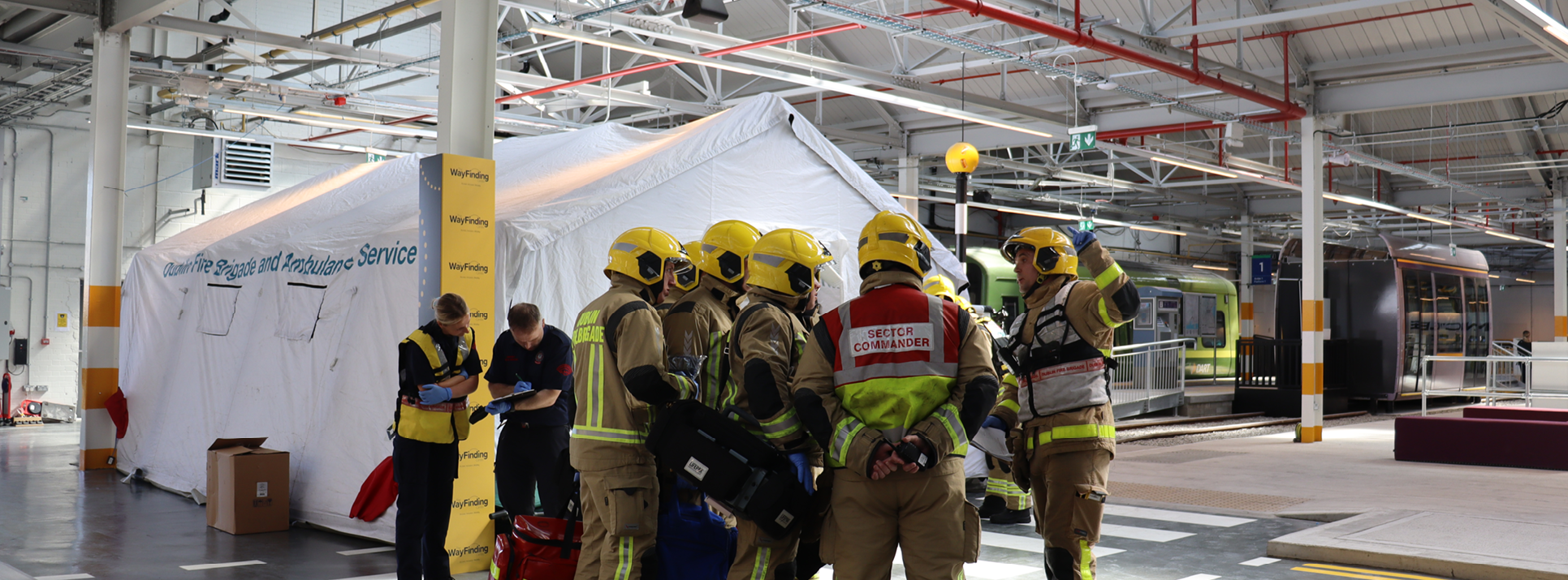 [Alt text:Firefighters and emergency personnel gather inside a transport depot for a safety drill. Their teamwork, diversity, and preparedness highlight collective responsibility in protecting all members of society, including those with disabilities, during emergencies.]