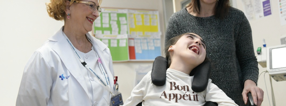 [Alt text: In a hospital, a healthcare professional and a mother share a moment of joy with a young girl using a wheelchair. The girl’s radiant laughter reflects dignity and connection, emphasizing the importance of empathy and inclusion in medical care.]
