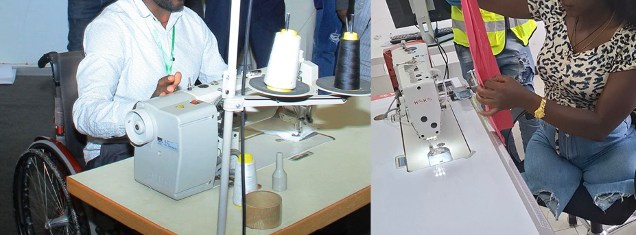 [Alt text:A young African woman attentively sews fabric using an accessible sewing machine while a man observes nearby. The scene reflects empowerment through vocational training and the importance of inclusive employment opportunities that value skill and independence.]