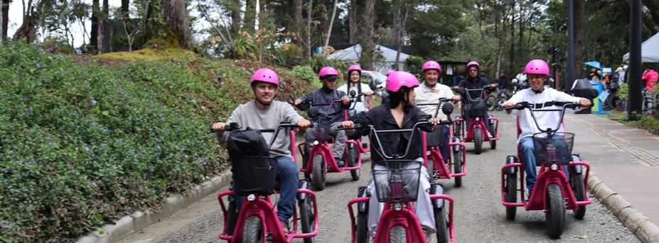 [Alt text: A joyful group of people rides adaptive tricycles through a park, wearing pink helmets. The image radiates freedom, inclusion, and shared recreation, showing how accessible outdoor activities foster community and well-being for everyone.]